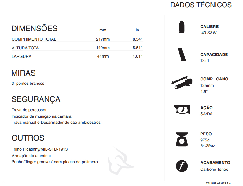 PISTOLA TAURUS 100 CAL. .40 S&W