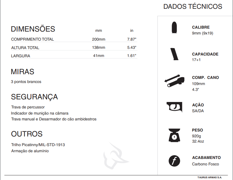 A PISTOLA TAURUS 917 possui capacidade de 17 tiros, calibre 9mm, cano de 109mm e mecanismo de disparo em ação simples e dupla, com cão externo e armação de alumínio. É adequada para a utilização em diversos segmentos, como: esportivo, militar, policial e defesa pessoal. É equipada com trilho picatinny para acoplamento de acessórios, trava manual e desarmador do cão ambidestros.