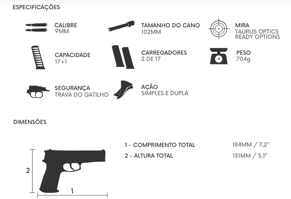 A PISTOLA TAURUS G3 T.O.R.O. (Taurus Optic Ready Option), disponível em ação simples e dupla de percussor lançado, calibre 9mm, possui capacidade de até 17 disparos, com cano de 102mm e acompanha dois carregadores de 17 tiros.