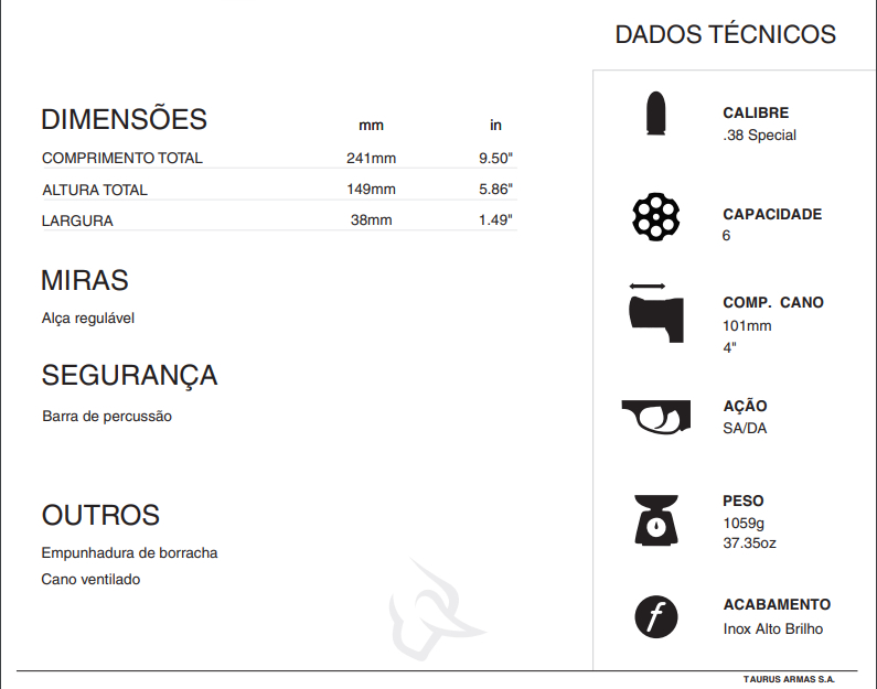 REVÓLVER TAURUS 889 CAL. .38SPL 4" ou 6"